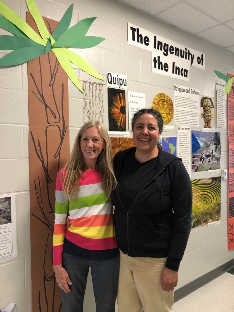 Along with the collaborative project I had a chance to learn about some of the recent engaging curriculum work Maryam had underway with students. You’ll find descriptions below of two units plus Words of Wisdom. It was fun for me to talk with students as they worked in the classroom space and the hall gallery they were creating with the completed work.