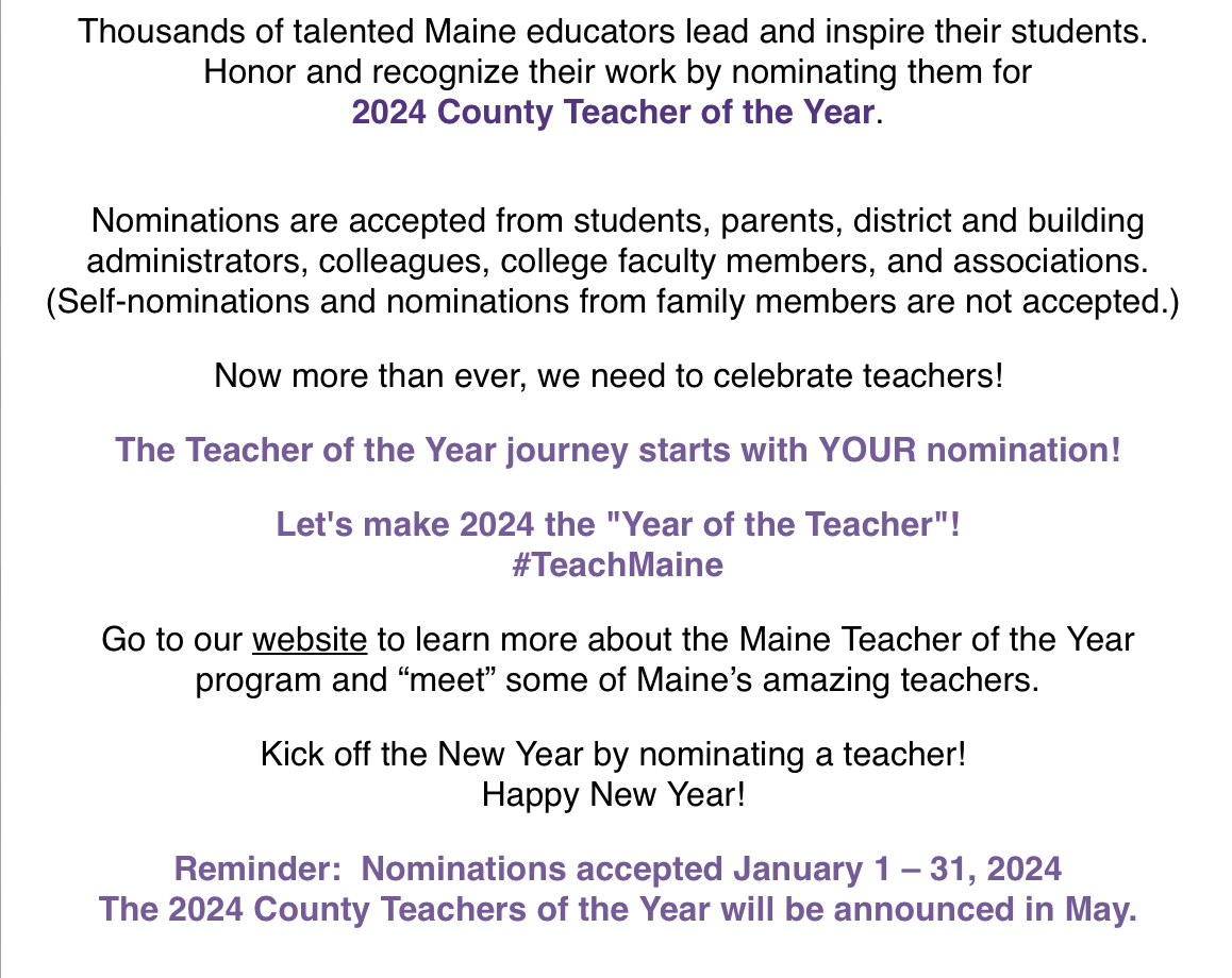 January 18, 2024Maine Teacher of the Year Program