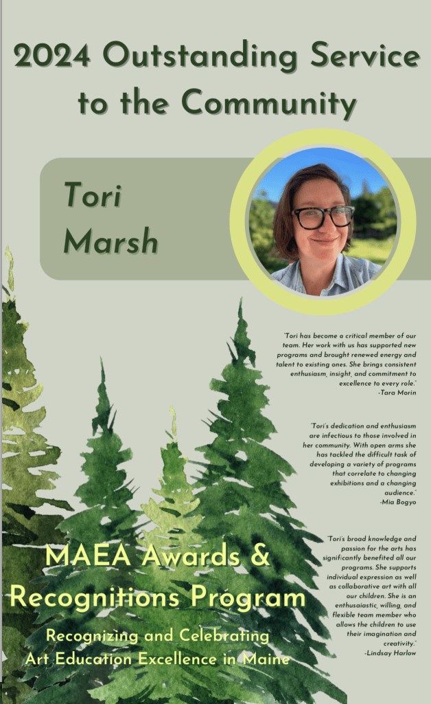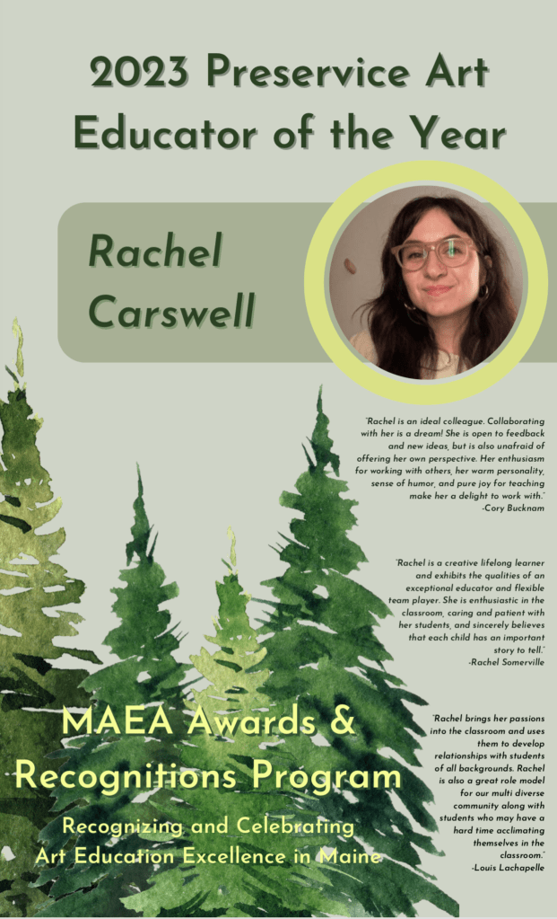 Each spring the Maine Art Education Association presents awards for contributions to the field. The awards presentation coincides with their annual spring conference. Being recognized for commitments to educating in the arts is critical for our students and the field in general. Congratulations to the following for their contributions.
