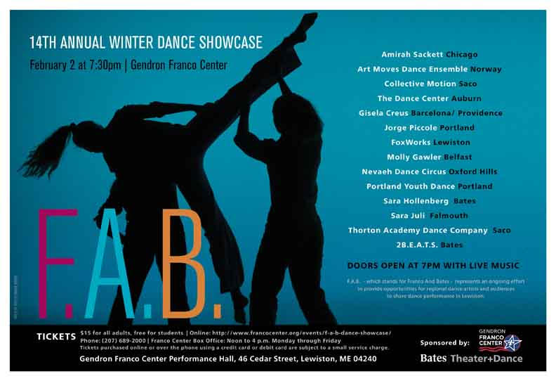 Including Thornton Academy Dance Company. February 2, 7:00 p.m., Gendron Franco Center. Tickets: $15.00 for adults, free for students. For tickets call Bates College at 689.2000. F.A.B. (Franco and Bates) represents an ongoing effort to provide opportunities for regional dance artists to present dance works in central Maine, as well as an opportunity for local audiences to have access to contemporary dance works. Visually stunning and kinetically mesmerizing, this event combines classic and modern dance pieces in one of L/A’s magnificent performance halls.
