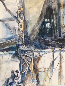 Throughout my trip, I had my sketchbook by my side. I drew the ancient Bodhi trees in Chiang Mai, the temples of Angkor Wat in Cambodia, and the motorbikes of Hanoi. As I was drawing Ta Prohm, a beautiful temple nearly overtaken by lush trees and moss, a tourist questioned me about why I didn’t just take a picture of it. I answered truthfully that “this is how I notice and experience things. I will remember the heat, the smells, the beauty, and even the discomfort of sitting here on this hard rock when I look back at this drawing.” The sketchbook drawings from my trip became the springboard for the work that I have taken on since I have been home and in my studio in South Berwick. As an educator who has always balanced teaching with studio practice, this sabbatical has given me the rare gift of time to develop new work. The subject matter of my new paintings has pulled closer to home, and the vibe of the work is exploratory and a truthful expression of how I experience the world.