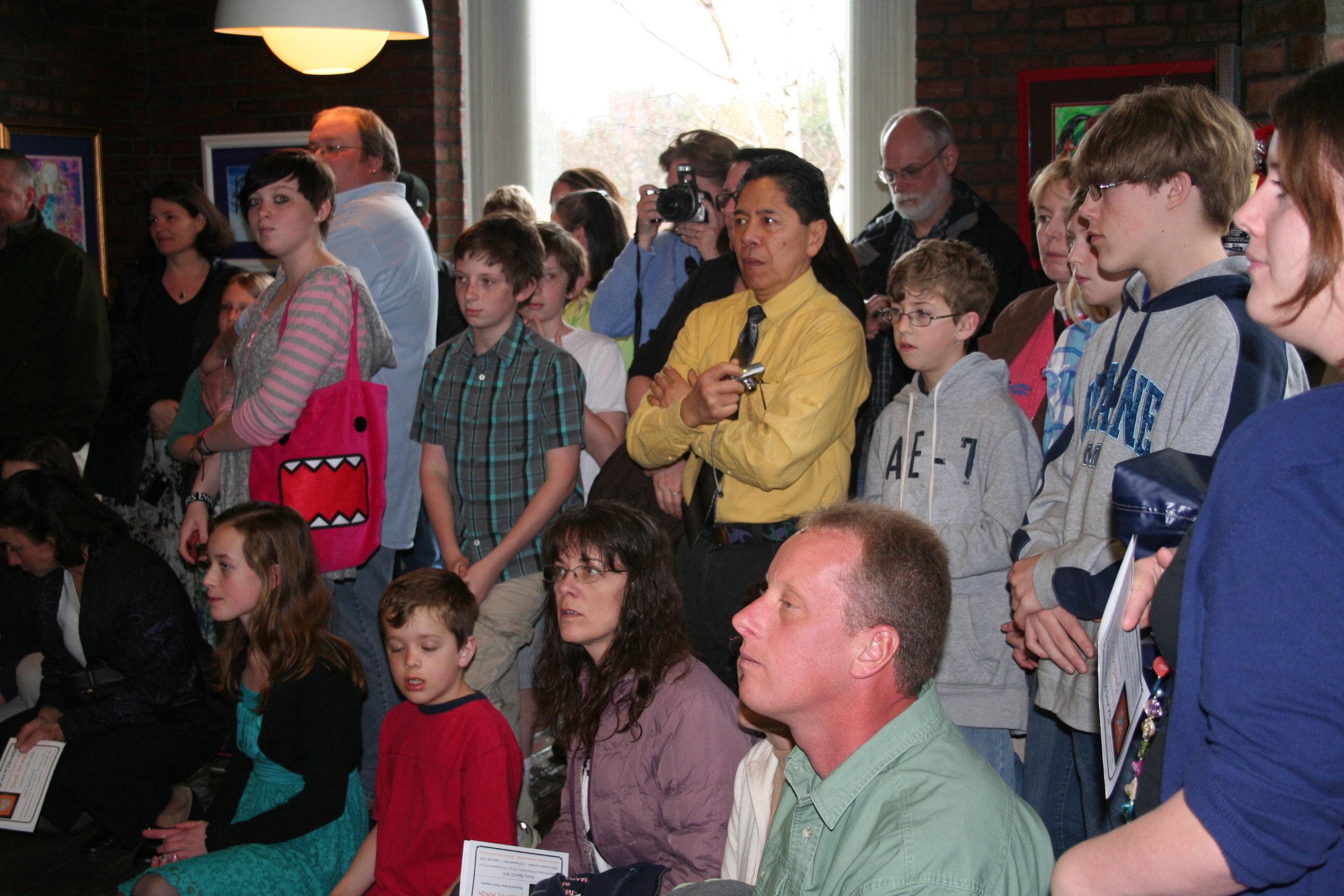 Dona was inspired by Christo and Jeanne-Claude’s 2005 art installation of The Gates in New York City’s Central Park. Students learned to temporarily transform an environment through art installation. With the help of the janitor, Craig Dunn, and the district volunteer coordinator, Nancy Mormon, the front hall became a learning lab for algebraic equations K-5. Cloth flags with dots (K), whole numbers (1-4) and fractions (5) hung four across to demonstrate a variety of equations of increasing difficulty.