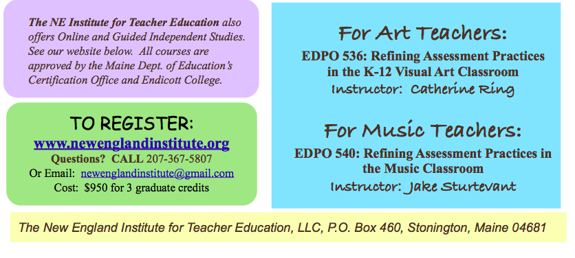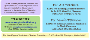 The biggest success is the Maine Arts Assessment Initiative (MAAI). The second phase of MAAI officially kicked off in the spring with the identification of 20 teacher leaders. These arts educators joined the 18 teacher leaders from phase one. They participated in a 4-day institute in August at the Maine College of Art (MECA) in Portland where they expanded their knowledge in the areas of assessment, leadership, technology, and creativity. They have created workshops that are being delivered throughout this school year at the regional and mega-regional level. (Registration for the mega-regional workshops is now open – FREE and contact hours are available.) The topics of the sessions are as varied as the individual teacher leaders. I am so grateful for their commitment to the work that is making a difference for arts teachers and in arts classrooms across Maine each day. The impact on students learning is amazing!
