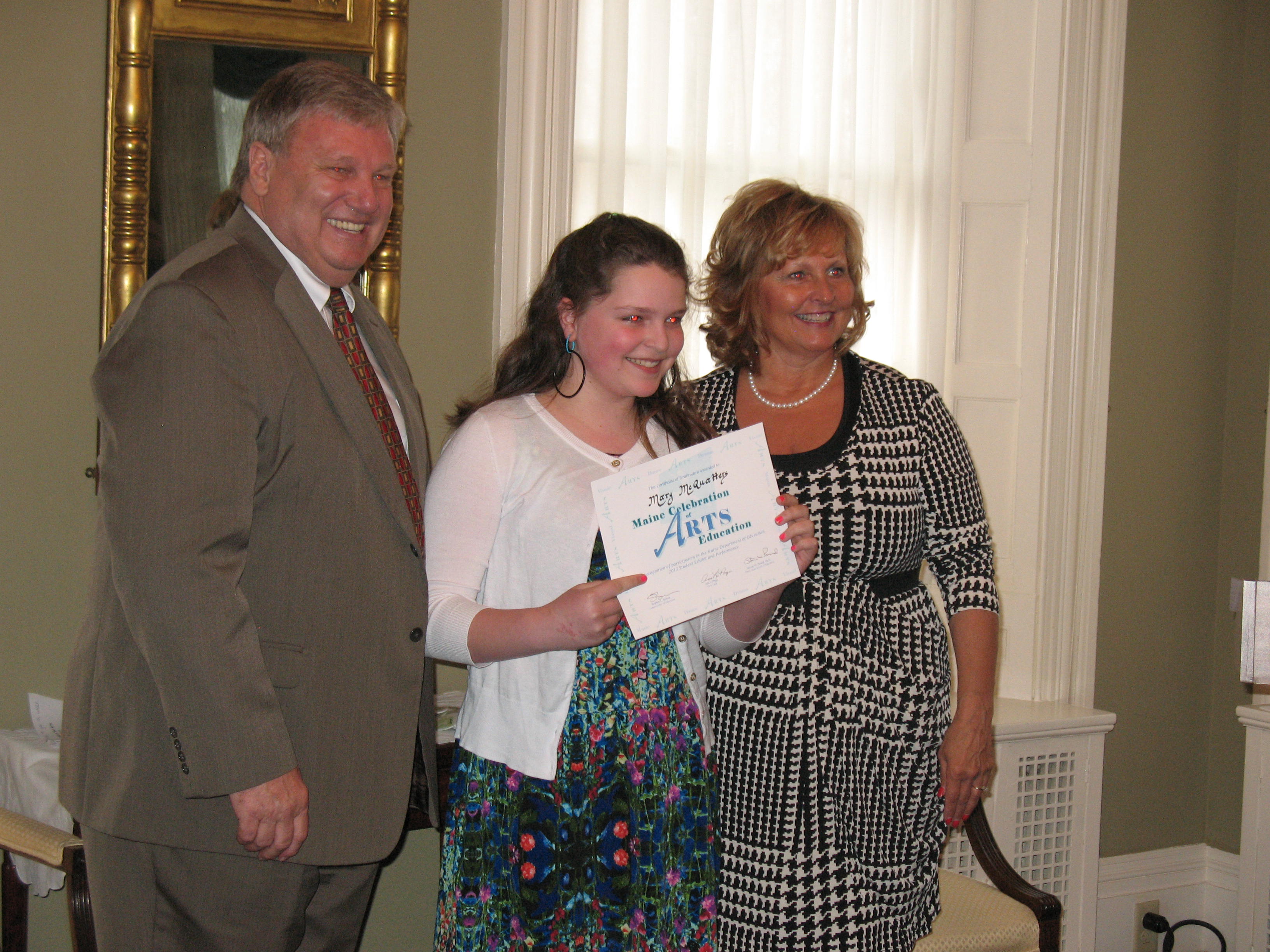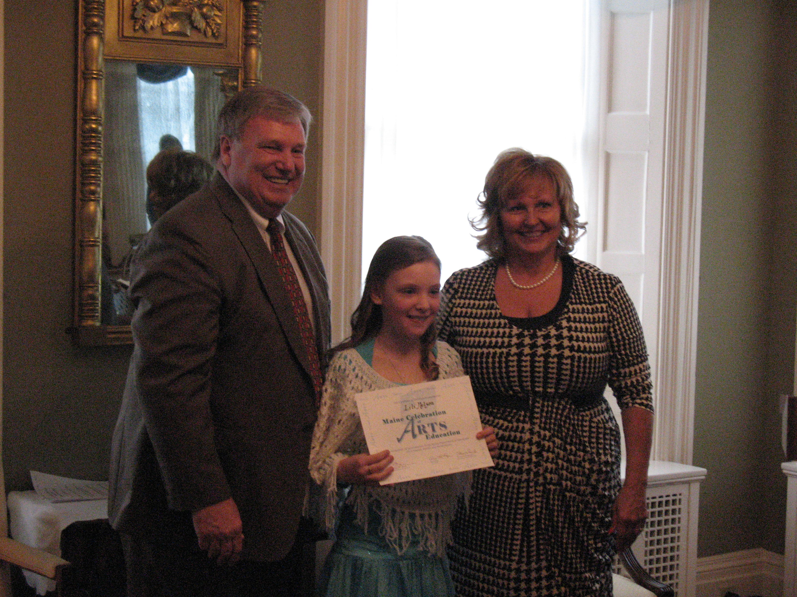 On Tuesday, April 9, we had a Celebration of Arts Education to recognize the accomplishments of artists and musicians from Camden-Rockport Elementary and Middle Schools and Camden Hills Regional High School. The First Lady, Ann LePage, Chair of the State Board of Education, Dr. Steven Pound, and the Department of Education came together to celebrate Arts Education. Twenty four students representing grades Kindergarten through 12 are exhibiting art work at the Department. Proud family members watched as the students were recognized for their accomplishments.