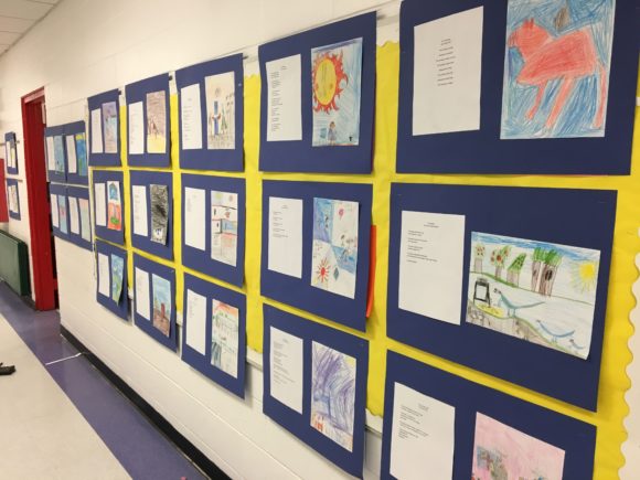 The residency spanned 11 days of teaching, plus an evening Showcase event, from the end of March to the middle of April. The aims were two-fold. First, to teach the second graders some important things about how to write poetry. But behind that, the goal was to use the writing of poetry to increase their overall confidence in themselves as writers and users of language.