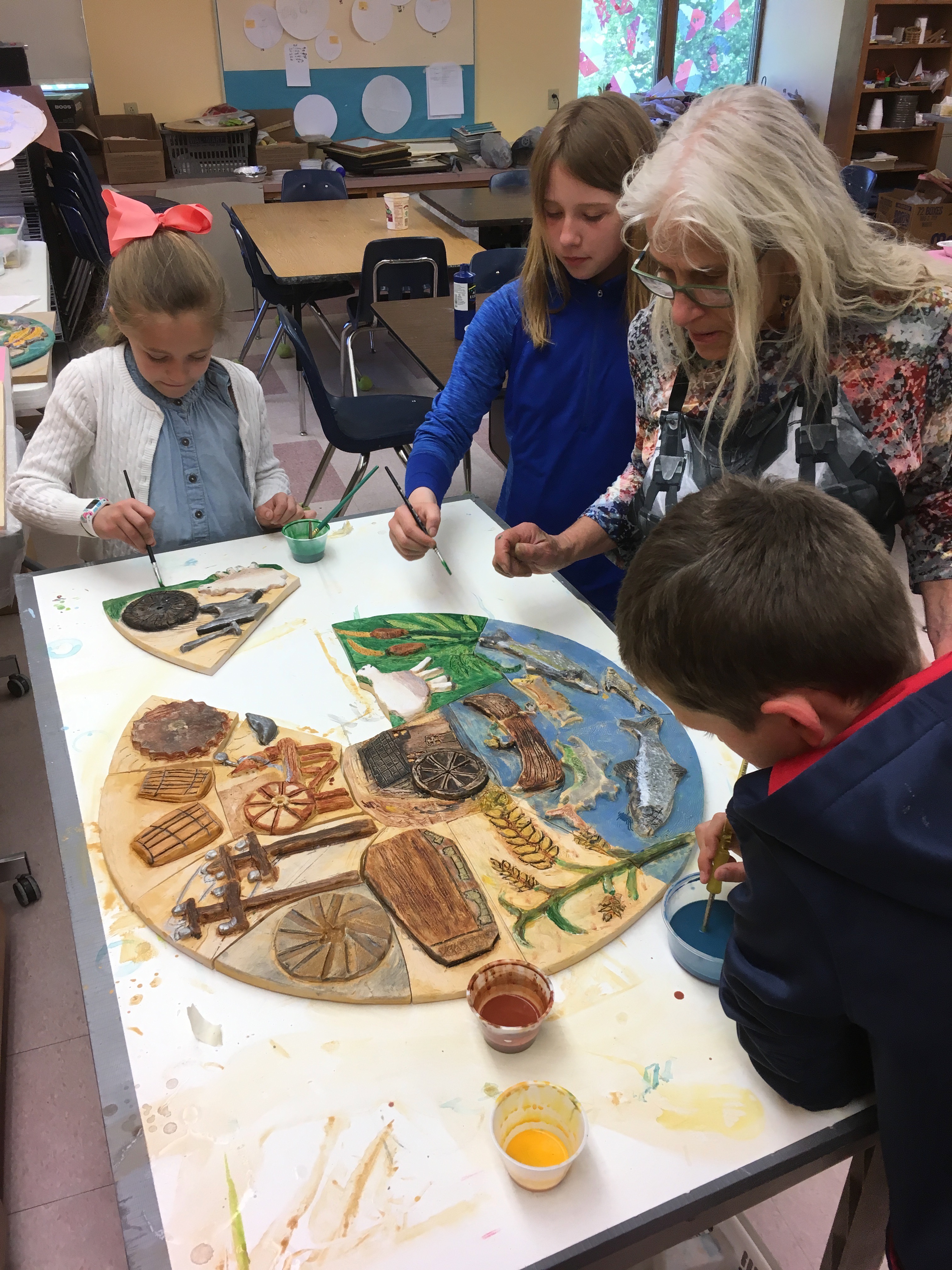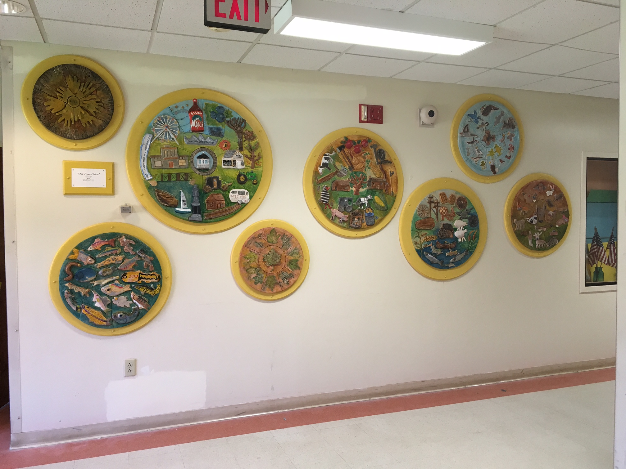 Union School has a long history of providing learning opportunities in visual art that go above and beyond the curriculum. When the school was built in 1987 George Mason provided two relief murals as part of the Percent for Art program. He followed that work with a month long residency with middle school students and created a relief tile mural based on Greek Mythology, an interdisciplinary unit. Over the years there have been several residencies with artists and large scale integrated projects that involved all of the elementary students and when the D.R. Gaul Middle School was housed upstairs, grade 7 and 8 students participated.