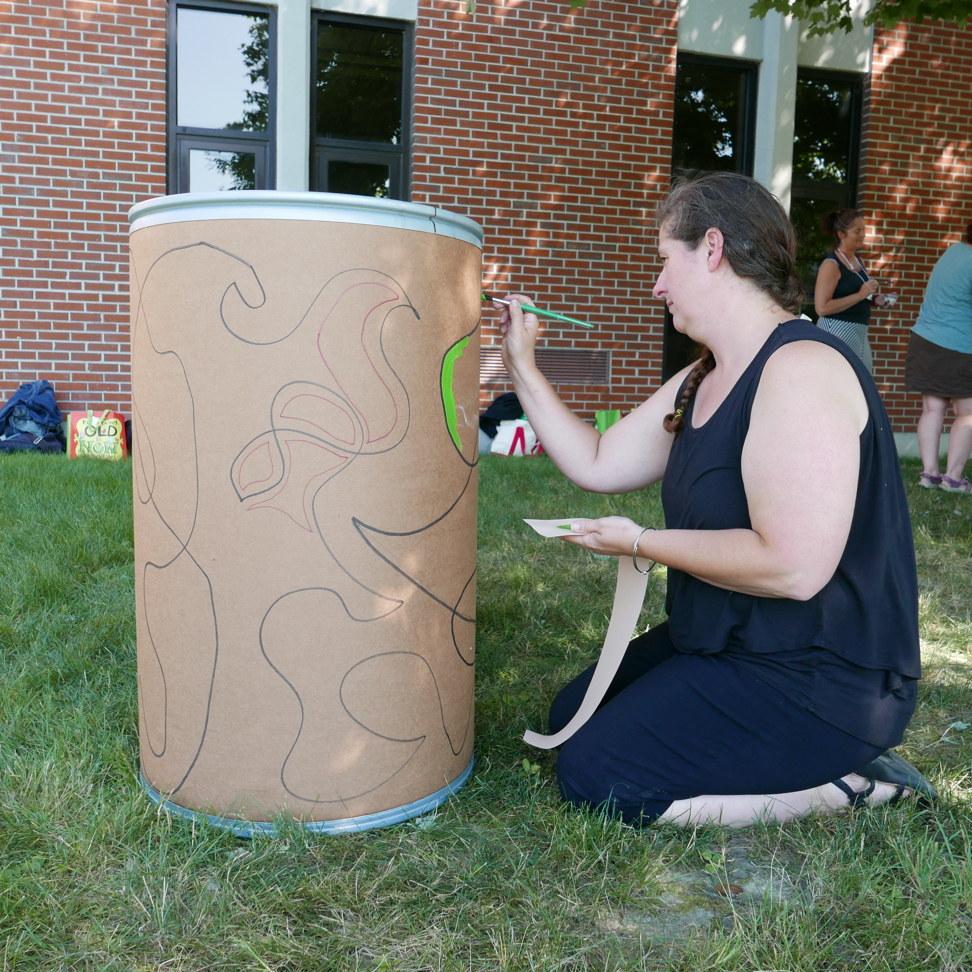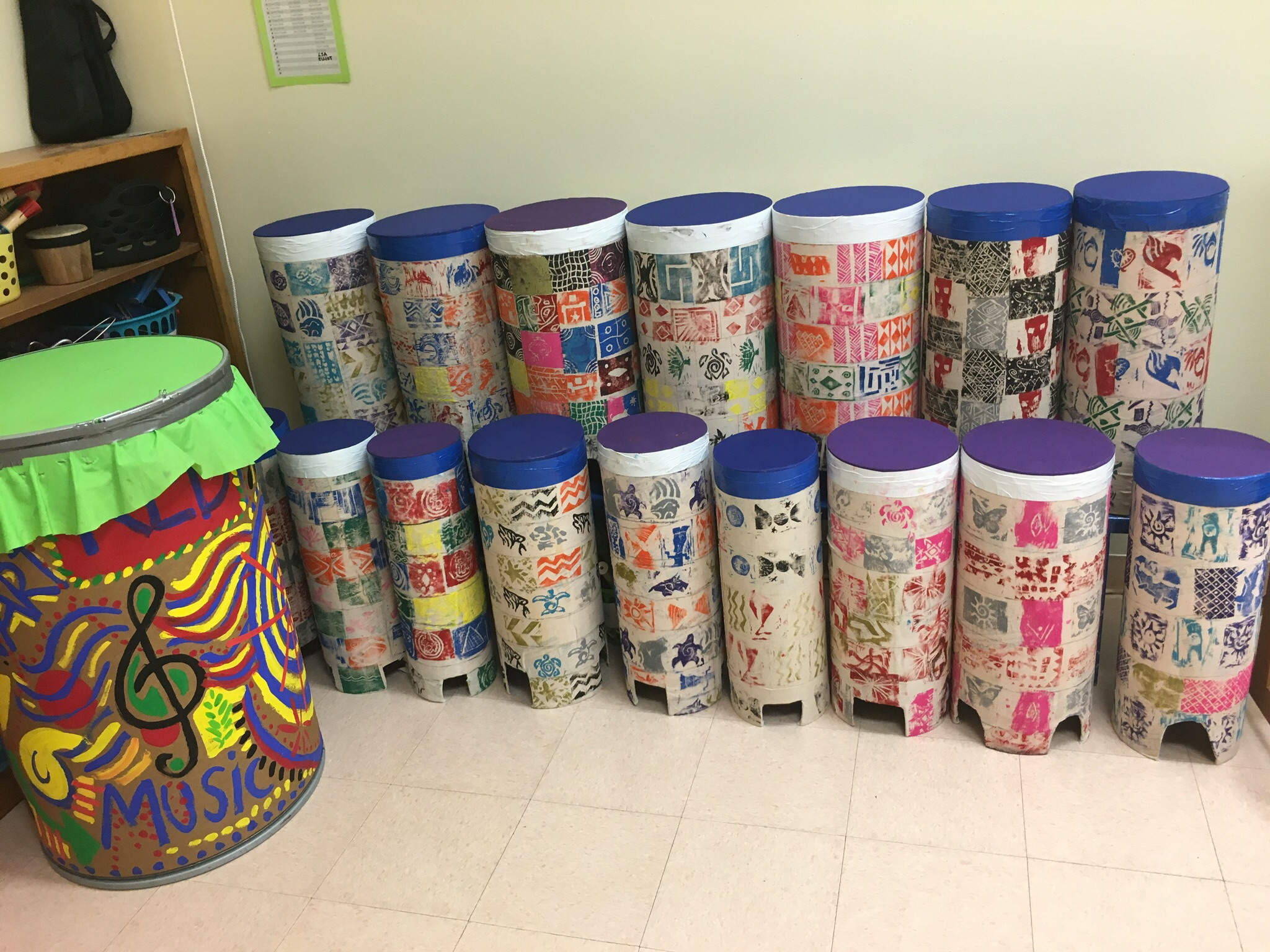 Hope worked with her general art & design students to build drums and create tribal printing stamps. They brought their ideas and stamps to the 5th graders who used the stamps to make designs on 16 drums.