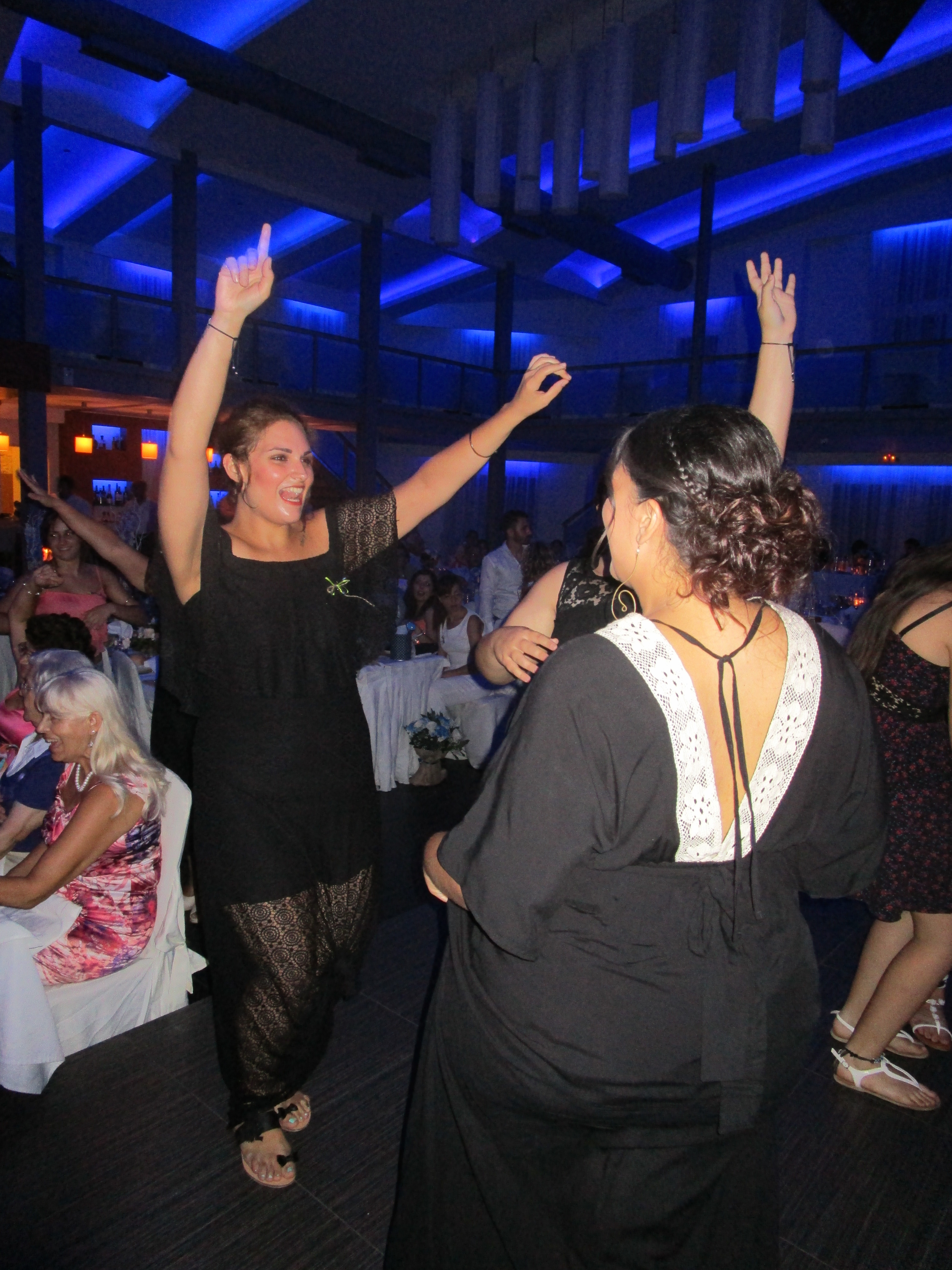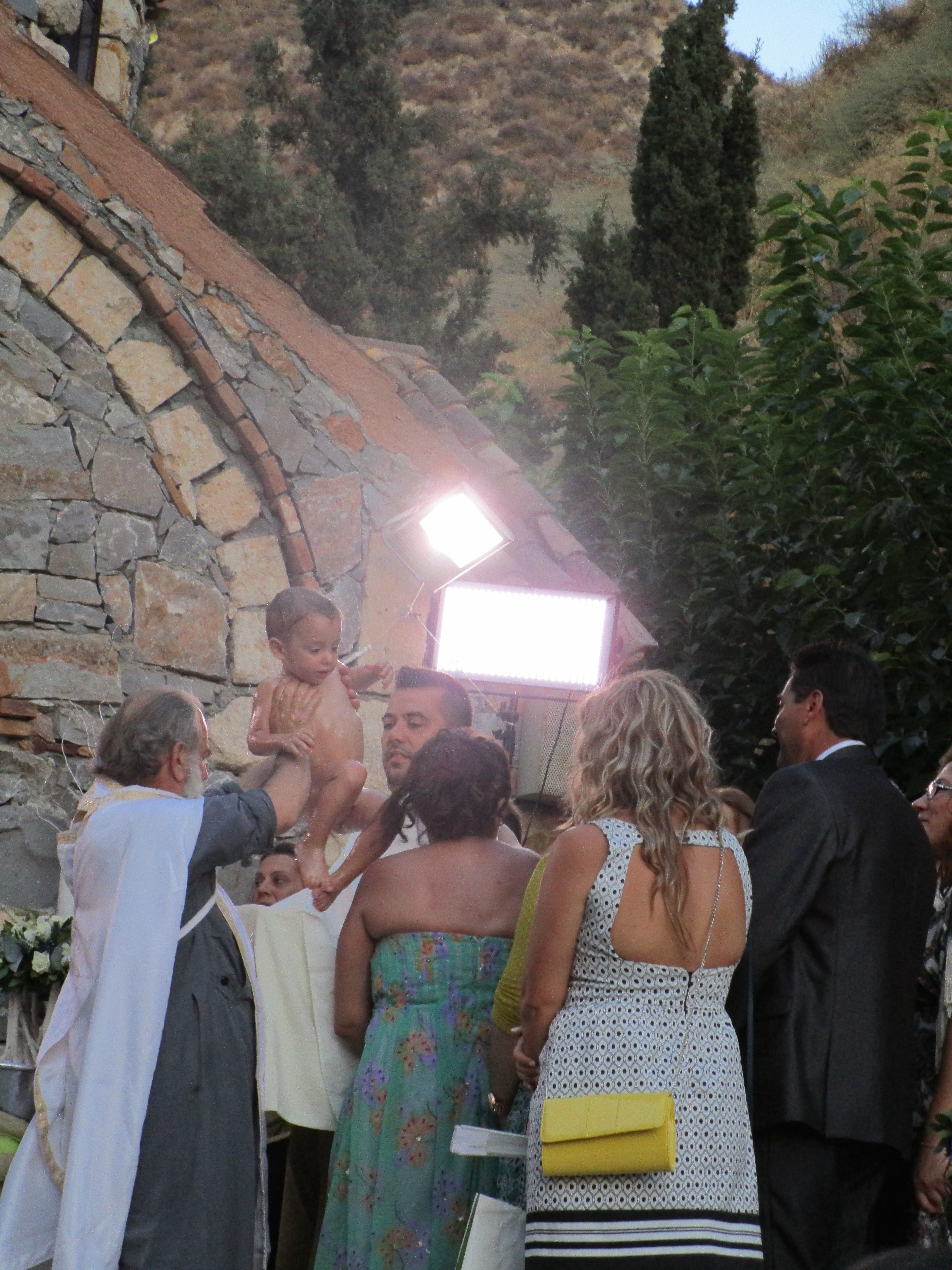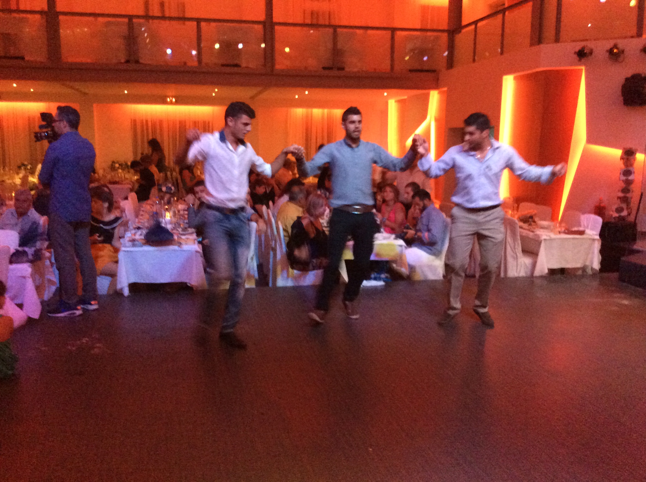 The wedding was equally wonderful taking place outside at a tiny Greek Orthodox church in a BIG setting. The church was built up against looming mountains and everywhere I looked it was beautiful as the sunset on the ceremony. The wedding ceremony wasn’t different than Greek weddings in the US but the setting was breath taking. You’ll notice in the photos the ribbon that is attaching the bride and groom. The stefana are crowns that signify that the bride and groom have become the king and queen of the newly formed family. The best man or in Greek, the koubaro steps behind the couple and places and interchanges the crowns three times, as a witness to the sealing of their union. Immediately following the wedding ceremony was the christening of the twins, which is a beautiful ceremony as well. The reception was filled with more incredible food, drink, music, and dancing.