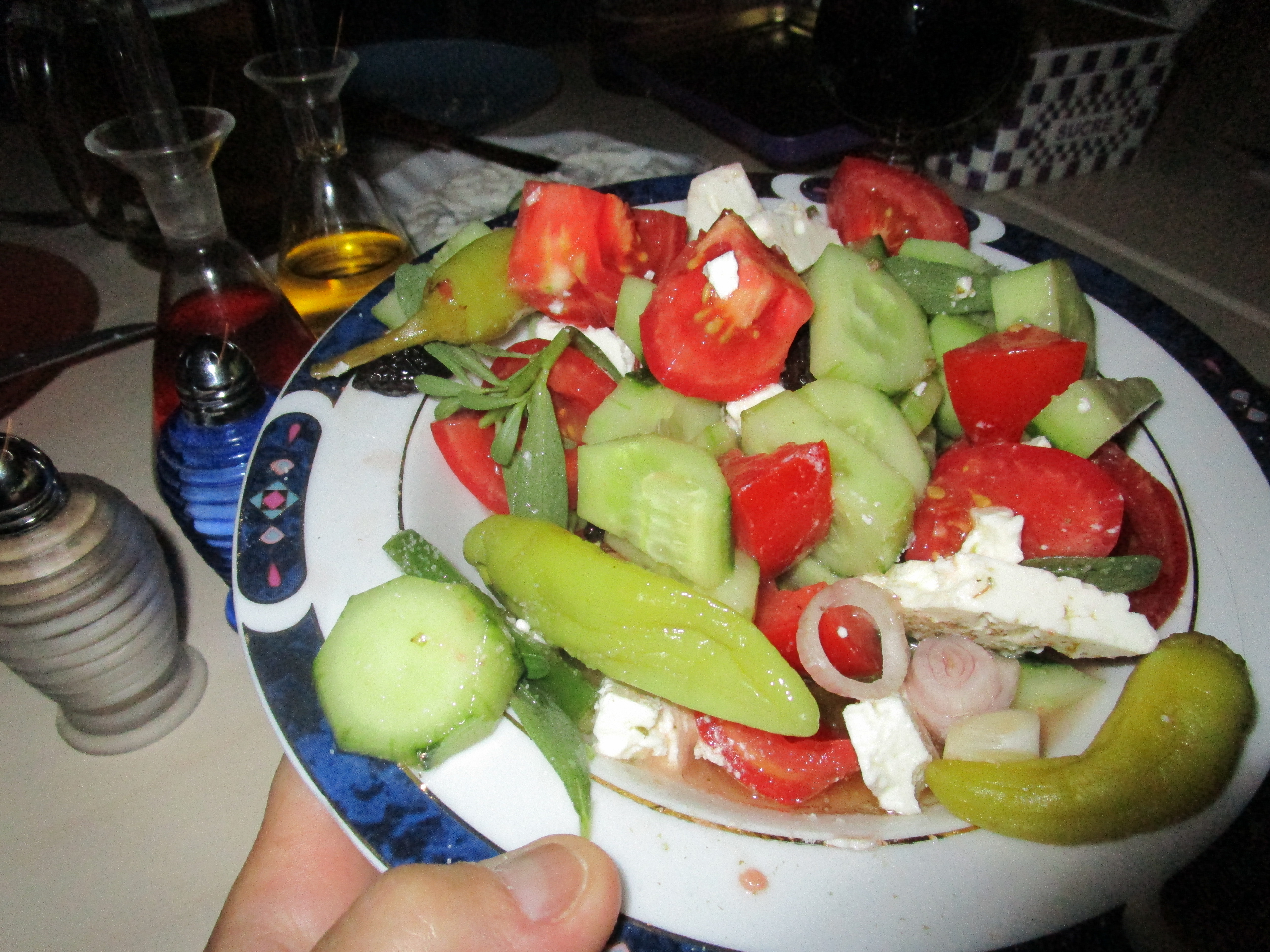 Everywhere we went the food was amazing. I love the way the Greeks call ahead and ask if the food establishment is open. There is no menu – the owner comes out to the outside tables and lists what they’ve cooked for the day. Usually 4 or 5 choices, at least one of lamb. Each serves a salad which is usually contains tomatoes and cucumbers. On a separate plate feta cheese and another olives. Often the family wine is available and delicious water from the spring on the property.