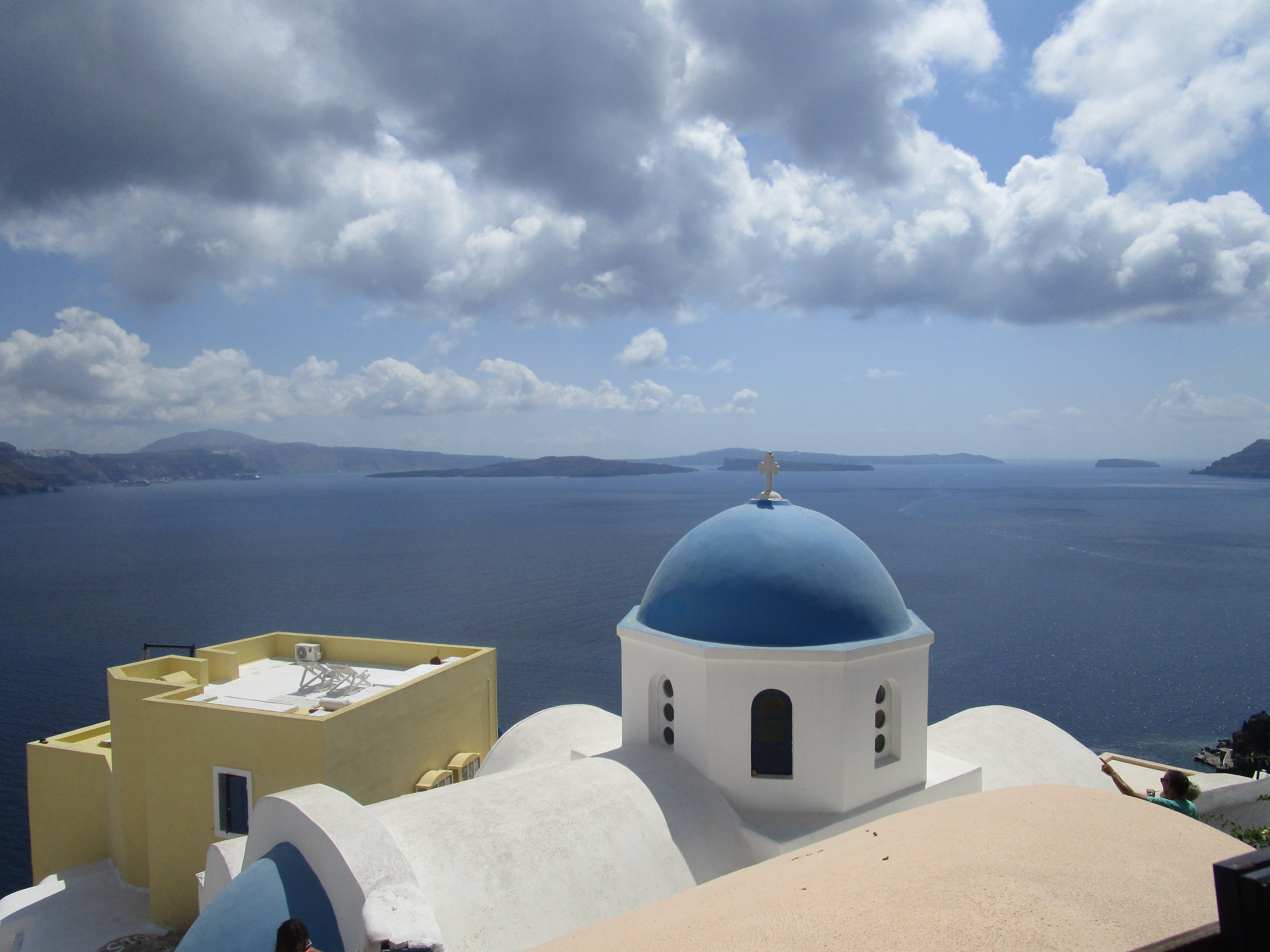 Following the wedding we visited the beautiful island of Santorini, where it was difficult not to take wonderful photographs! Everywhere we went during the two weeks it was very warm and unusually humid. The sun was brilliant, even at 9AM. Many people swim at the beautiful beaches and spend time outside. The sky is a brilliant blue. Homes have verandas which are extensions of their indoor living space. Many of the restaurants are in side yards of peoples homes.
