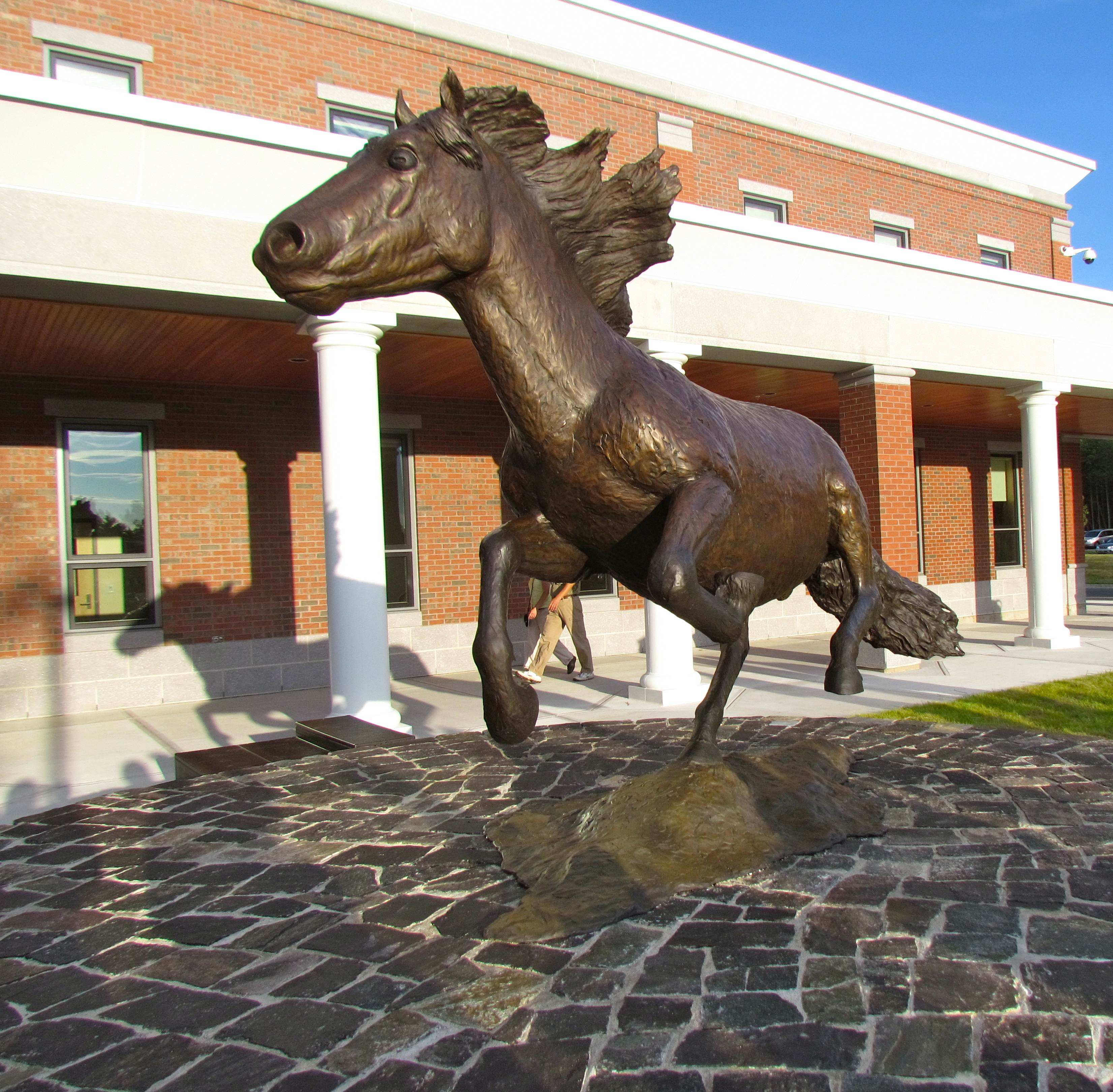 The following update is from art educator Leah Olson who had submitted photos in the spring that I posted about the sculpture being created for the new Hampden Academy. Students and teachers have just moved in to the new school, and so has the bronco.