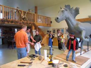 When we arrived at the studio, the Bronco was completely encased with a white rubber coating. Quite a shock as I was used to seeing the gray clay. The goal of the 24 hour day was to get the sculpture completely covered with plaster. The studio was set up for beginning the process of adding the plaster. Officer Stewart, James and I worked outside making “birds nests” from hemp that is used to create a strong plaster mold. Jacob worked with the other men adding the plaster to the Bronco. My son had the fortunate job of unwrapping the small bronze sculptures from the foundry that are sold in gallery spaces. He was also busy taking pictures with his IPad so he could document his experience. I think he took about a hundred pictures and then he learned about “editing”.