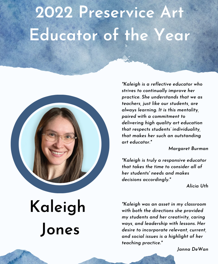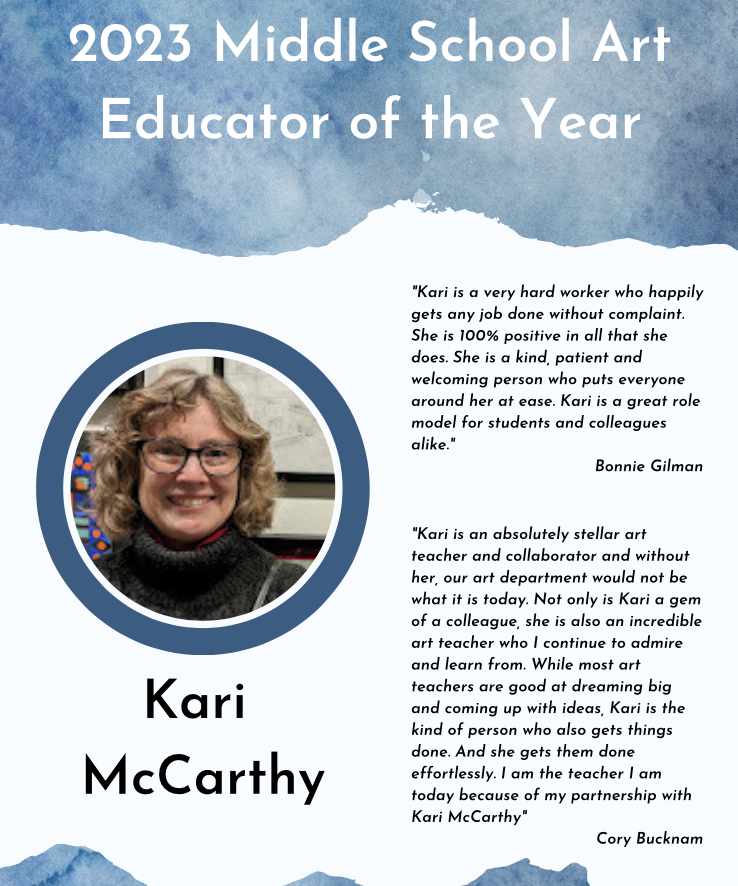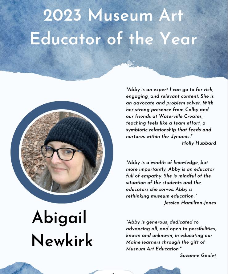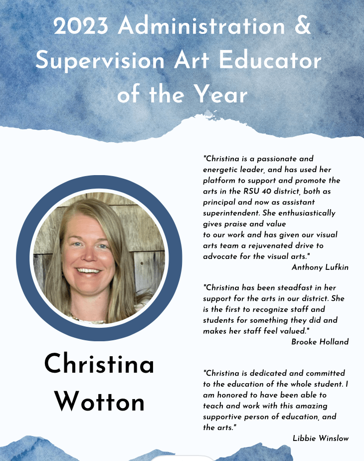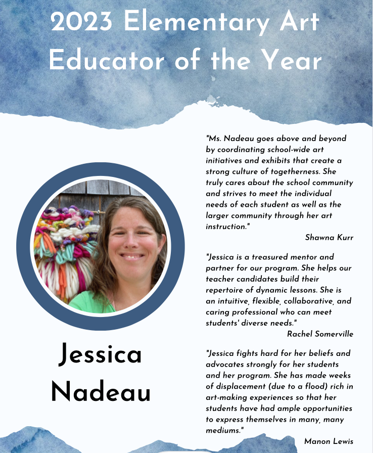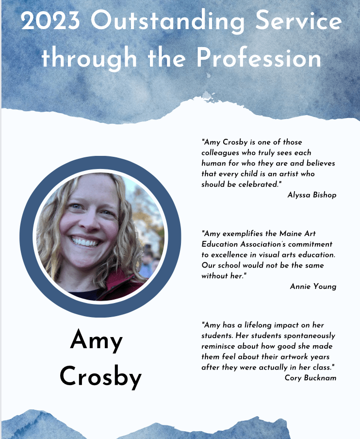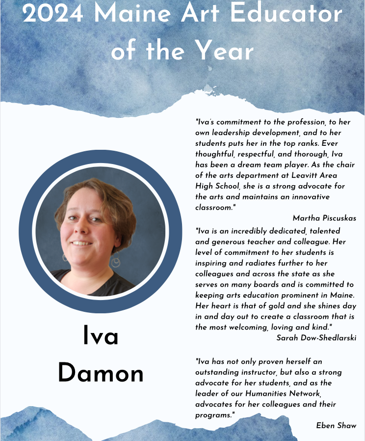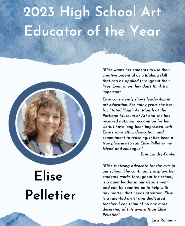Each Spring the Maine Art Education Association (MAEA) presents awards to individuals who are committed to quality visual art education. Some of these educators have been in the ‘trenches’ with ‘kids’, of all ages, for many years. Others are just beginning their careers, and yet others support quality art education from a distance impacting the lives of learners. Each individual is to be commended for their contributions to the profession.