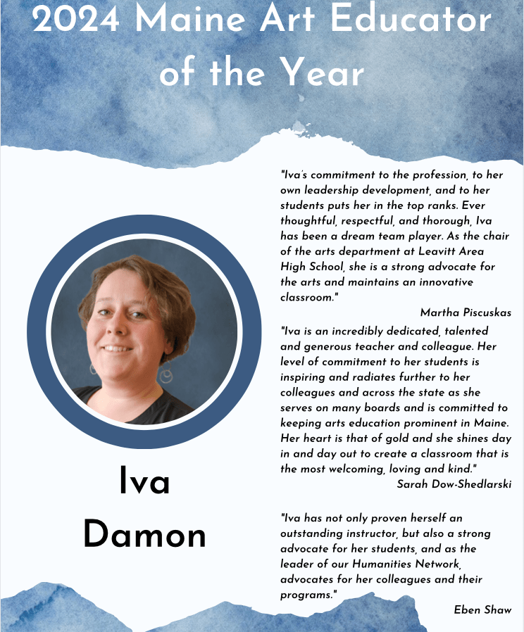 The purpose of this blog is to share stories about people and places; and to celebrate the amazing work (and play) that students, educators, and organizations are doing in and for arts education. In addition, the blog has a plethora of resources and innovative ideas. This forum gives blog readers the opportunity to learn from each other. It is essential that we listen, learn, and collaborate in order to build on teaching practices for the benefit of every learner in Maine and beyond.