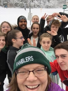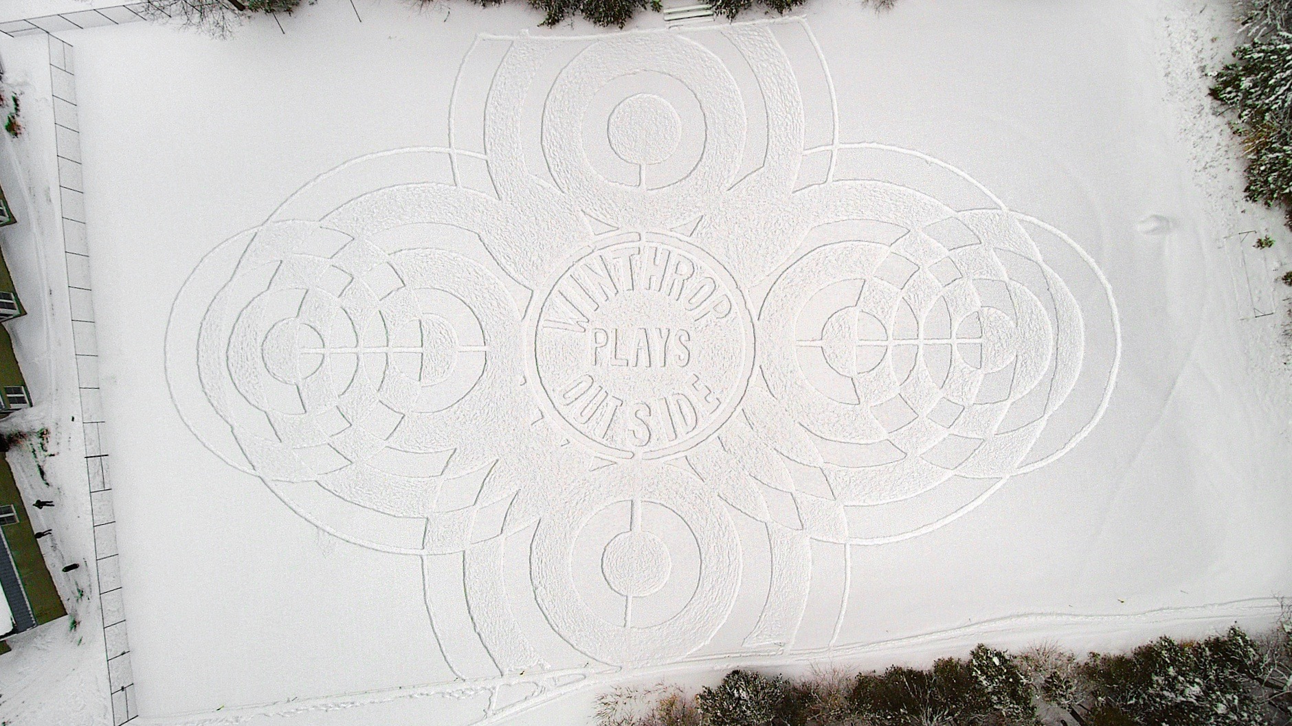 March delivered great snow. We got 12 inches of fresh snow on March 8 and 9 and the magic happened. Jason arrived at school at sunrise and sketched the design in snow. He laid down the initial circles and paths for students to follow. We kept the groups small, we had 12 pairs of snow shoes. Students were given directions to follow the path and follow Jason’s directions. Students could watch if they did not want to participate. For many students this was the first time on snow shoes. However, when the first drone pictures came out, more students wanted to participate. About 150 students in grades 6, 7 and 8 created the work of art with Jason.