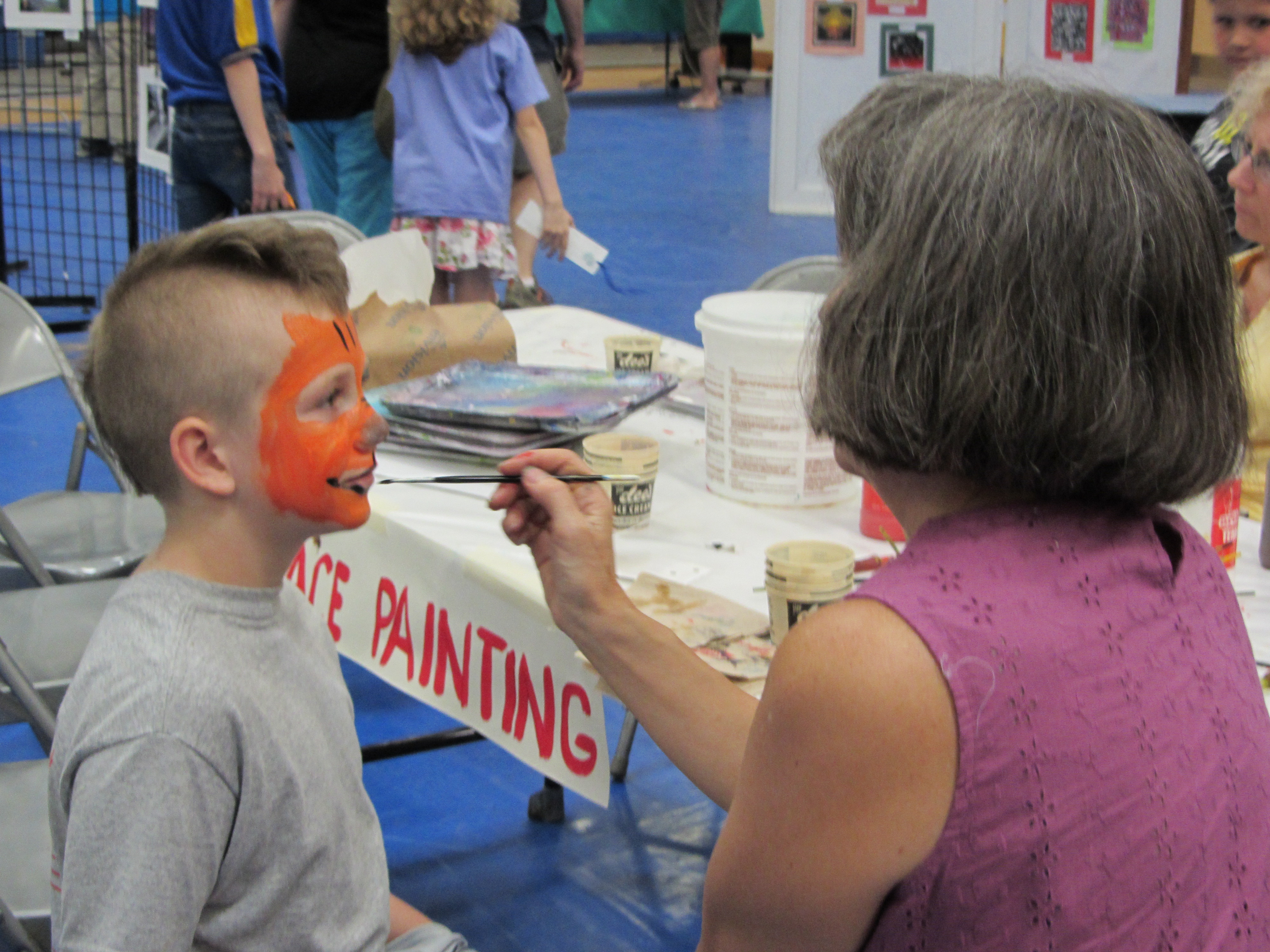 There were opportunities for students to engage in hands on activities: hat making, t-shirt screening (the 2012 Arts Festival Logo), face painting, & card/book mark making with stamps. One highlight of the event was the life like recreations of Grant Wood’s American Gothic & Edvard Munch’s The Scream. In both works, the faces were cut out, so people could stand behind the works and literally become a part of the paintings. The event was a huge success, judging by the number of students who were still talking about it the next day and still donning their face paintings and silk screened shirts.