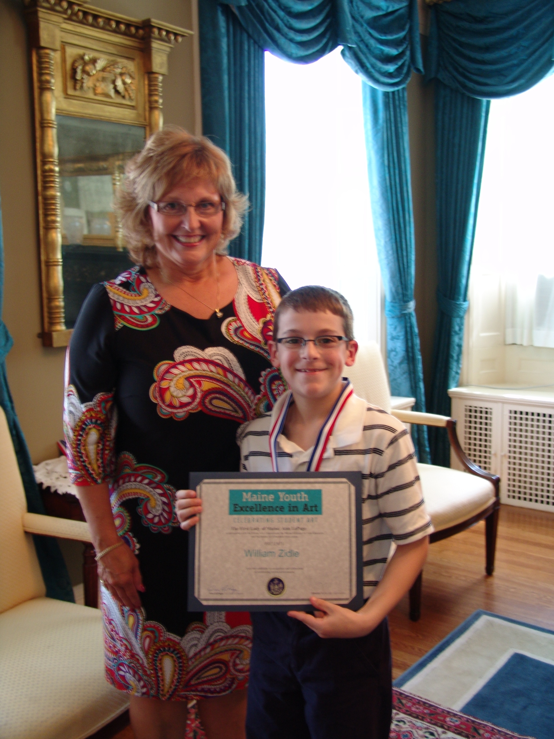 Students whose art work is part of the Maine Youth Excellence in Art exhibit, sponsored by the Maine Art Commission, were recognized today at a ceremony with First Lady Ann LePage. Julie Horn from the Maine Arts Commission opened the program by gathering students for a photograph on the steps in the Hall of Flags of the State House. Julie Richard, Maine Arts Commission Executive Director and Charles Stanhope, Chair of the Commission joined the First Lady in congratulating the students, parents, and art teachers.