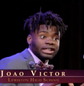 Joao Victor represented Maine and was scheduled during the first time slot, 9:00 a.m. – 12:00 p.m. He recited two poems along with 17 other students. Students at Lewiston High School watched from their classrooms along with students, teachers, and community members from across the state. Everyone was excited when Victor’s name was called as one of 8 students to move to the next round, reciting a third poem.