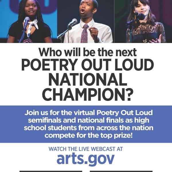 On Sunday, May 2, 2021 beginning at 12pm ET, the Poetry Out Loud national semifinals will be broadcast through a one-time-only webcast at arts.gov/poetry-out-loud. Each of the 55 champions submit in advance video recordings of their poetry recitations, which will be reviewed and scored by judges with expertise in poetry, performance, and the literary arts. The recitations from all 55 students will be broadcast on May 2 as part of one of three regional semifinals, and will include the announcement of the top nine students (three from each region) who will advance in the competition. Visit arts.gov/poetry-out-loud for the full semifinals schedule.
