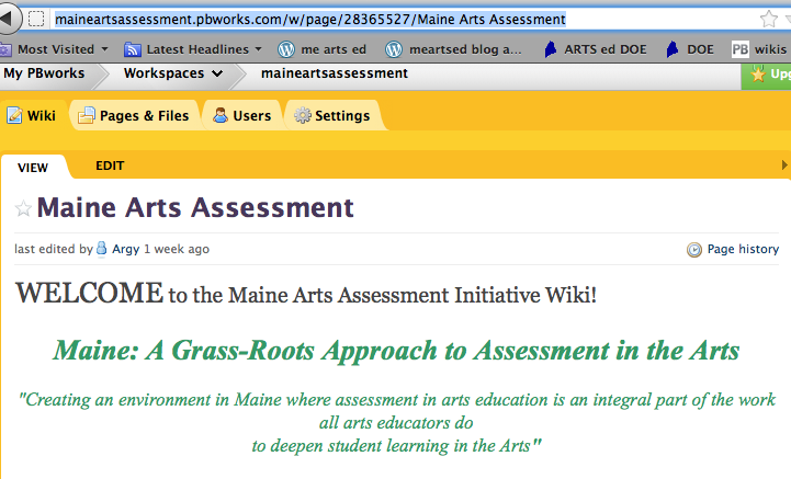Recently revamping the Maine Arts Assessment Initiative wiki moved to the top of the list of “things to do”. It was prompted by a question from the field, a high school art teacher who emailed asking if the information (“notes and/or minutes”) from the summer teacher leader assessment institute sessions was available. He has been following the work of the Maine Arts Assessment Initiative (MAAI) including the blog posts, webinars, and other resources we have made available on the wiki http://maineartsassessment.pbworks.com and Department assessment webpage http://www.maine.gov/education/lres/vpa/assessment.html. It was as if the teacher had whacked me upside the head. I thought “why don’t we post the handouts, links, and information that we provided in each of the sessions?”
