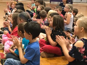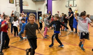 Nearing the gym, through the corridor literally owned and decorated by the K-third grade Central School students in South Berwick, one could already hear the rhythmical claps of a class fully engaged in old-time dancing. Recently I paid a visit to Kate Smith’s music program, where the whole school was treated to a residency with Maine Arts Commission Teaching Artists Hunt and Allison Smith, who played and taught old English, Irish and even Russian dances throughout the  week.
