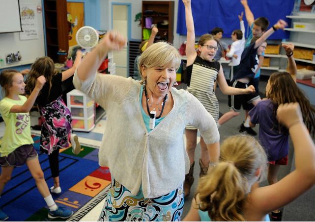 Karen Renton joins her pupils in an exciting and action-packed song called “Sasha.” Gordon Chibroski/Staff Photographer